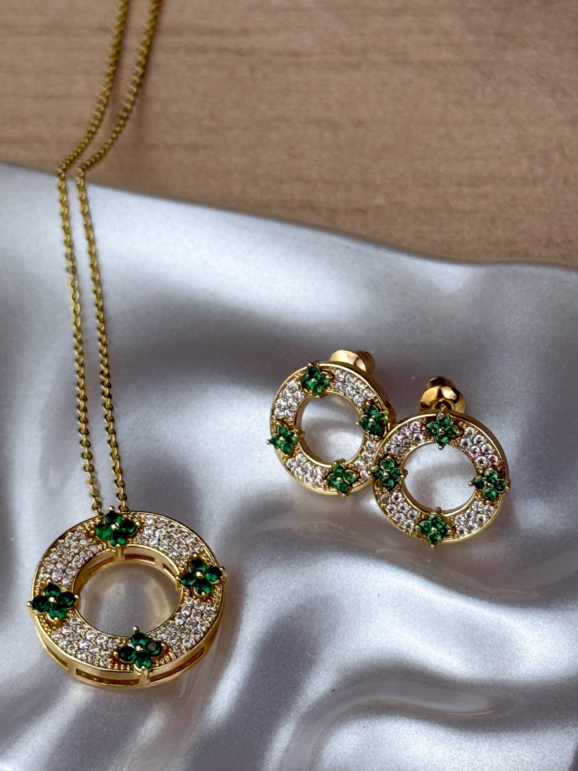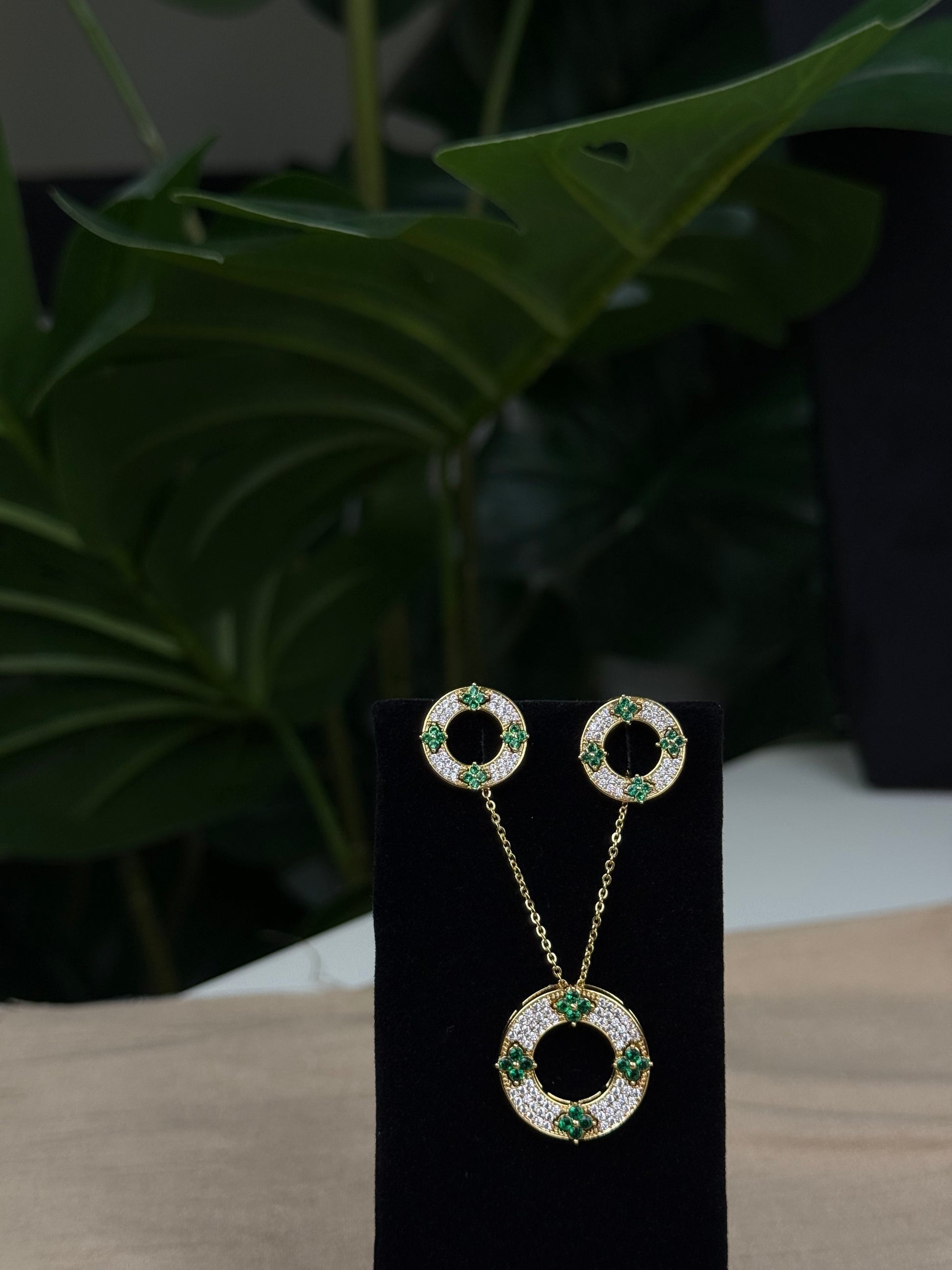 Elevate your everyday elegance with the Ava Drop set. Featuring a graceful necklace and matching earrings, each piece is adorned with a delicate circle design accented by four green, diamond-like stones. A perfect blend of subtle sparkle and modern charm, ideal for adding a refreshing touch to any outfit.