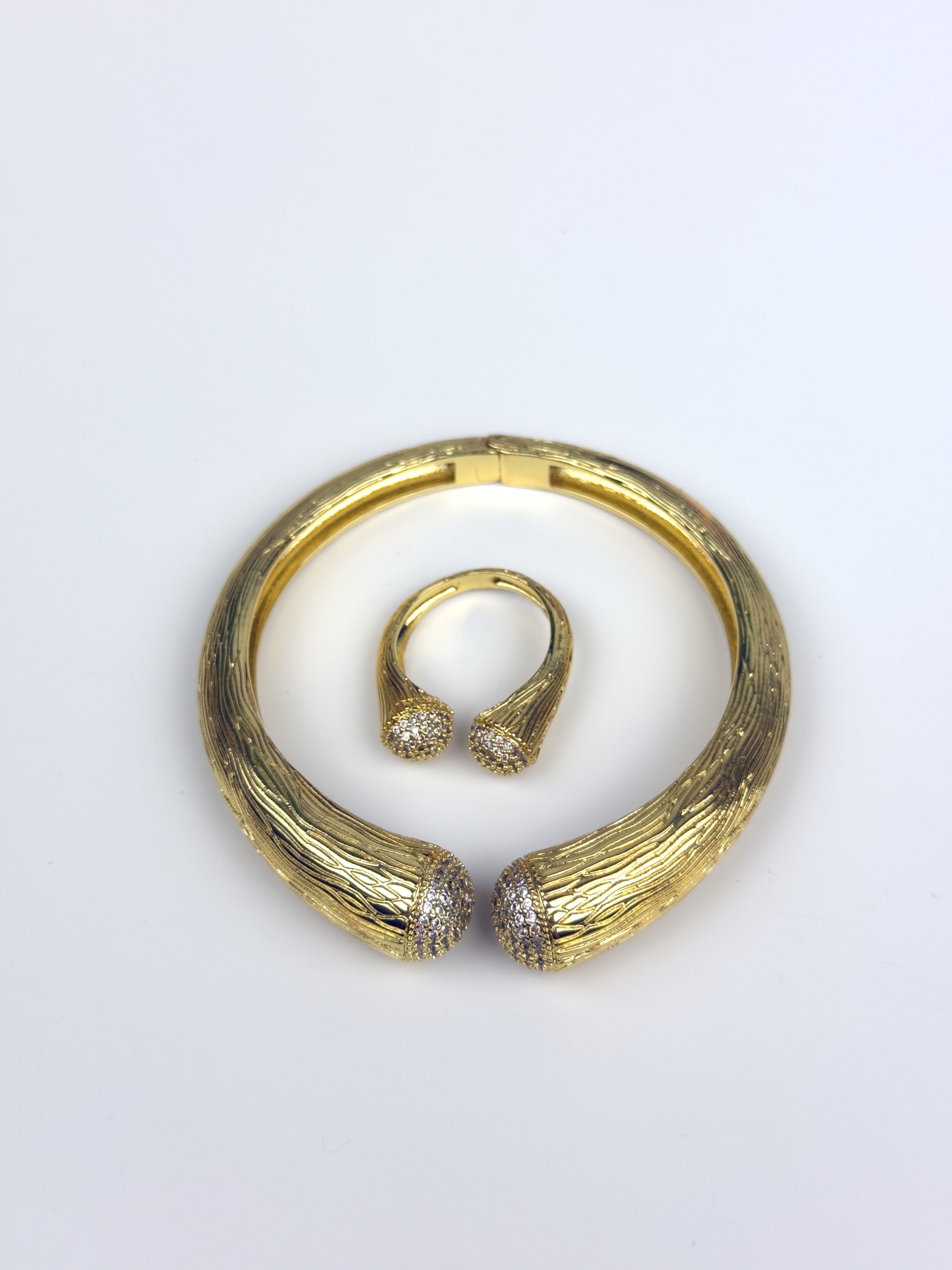 Elevate your style with the Golden Bloom Set, a stunning combination of bold design and refined sparkle. Featuring a beautifully textured gold-tone bracelet and matching ring, each piece is crafted to mimic the organic patterns of nature. The elegant pavé crystal tips add a luxurious finish, catching the light with every movement