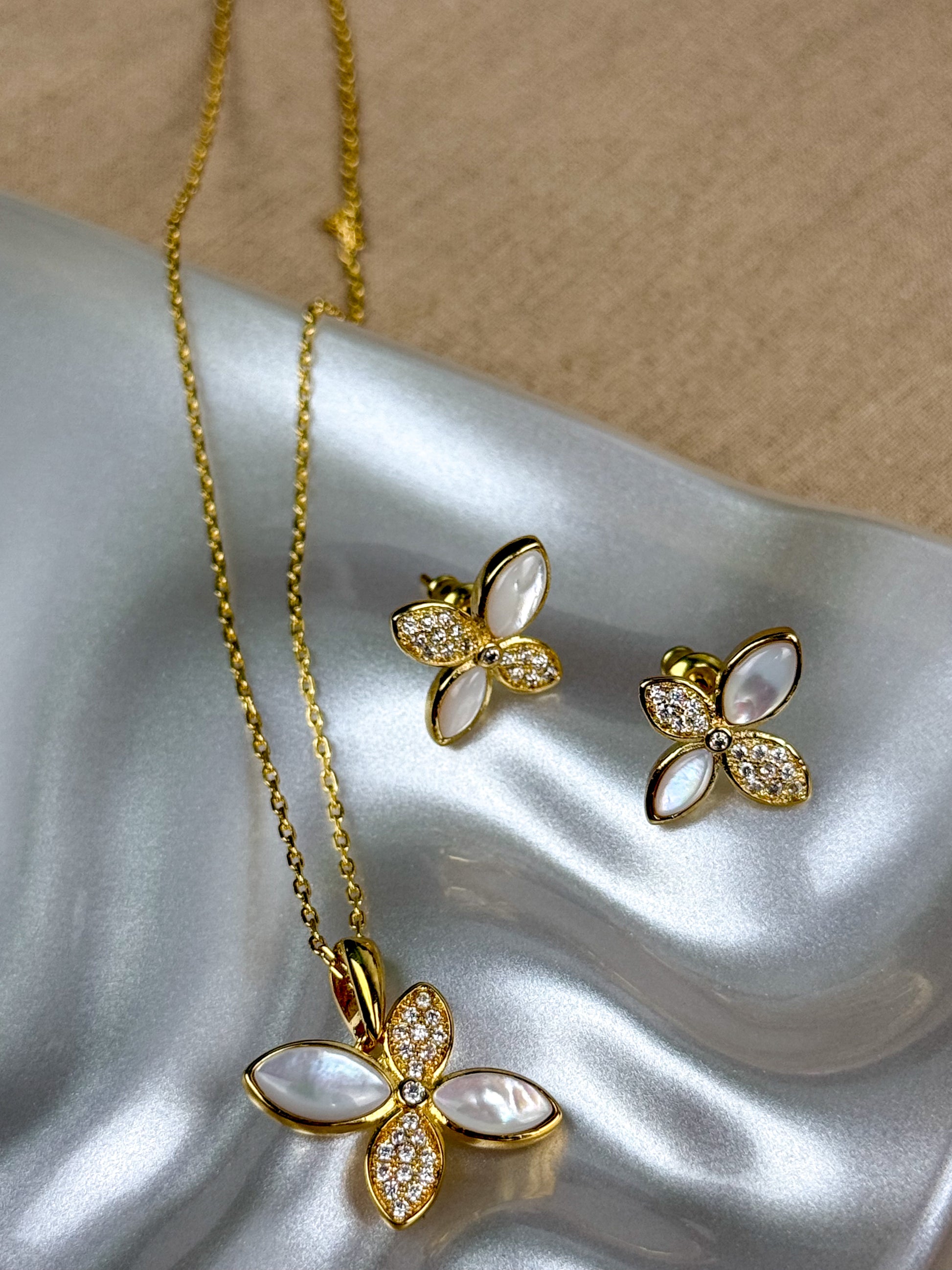 Let your elegance bloom with the Lumi Charm in White. This delicate set, featuring a finely crafted flower-shaped necklace and matching earrings, captures the soft beauty of nature with a pure, radiant touch. Perfect for adding a whisper of grace to your everyday style or special occasions.