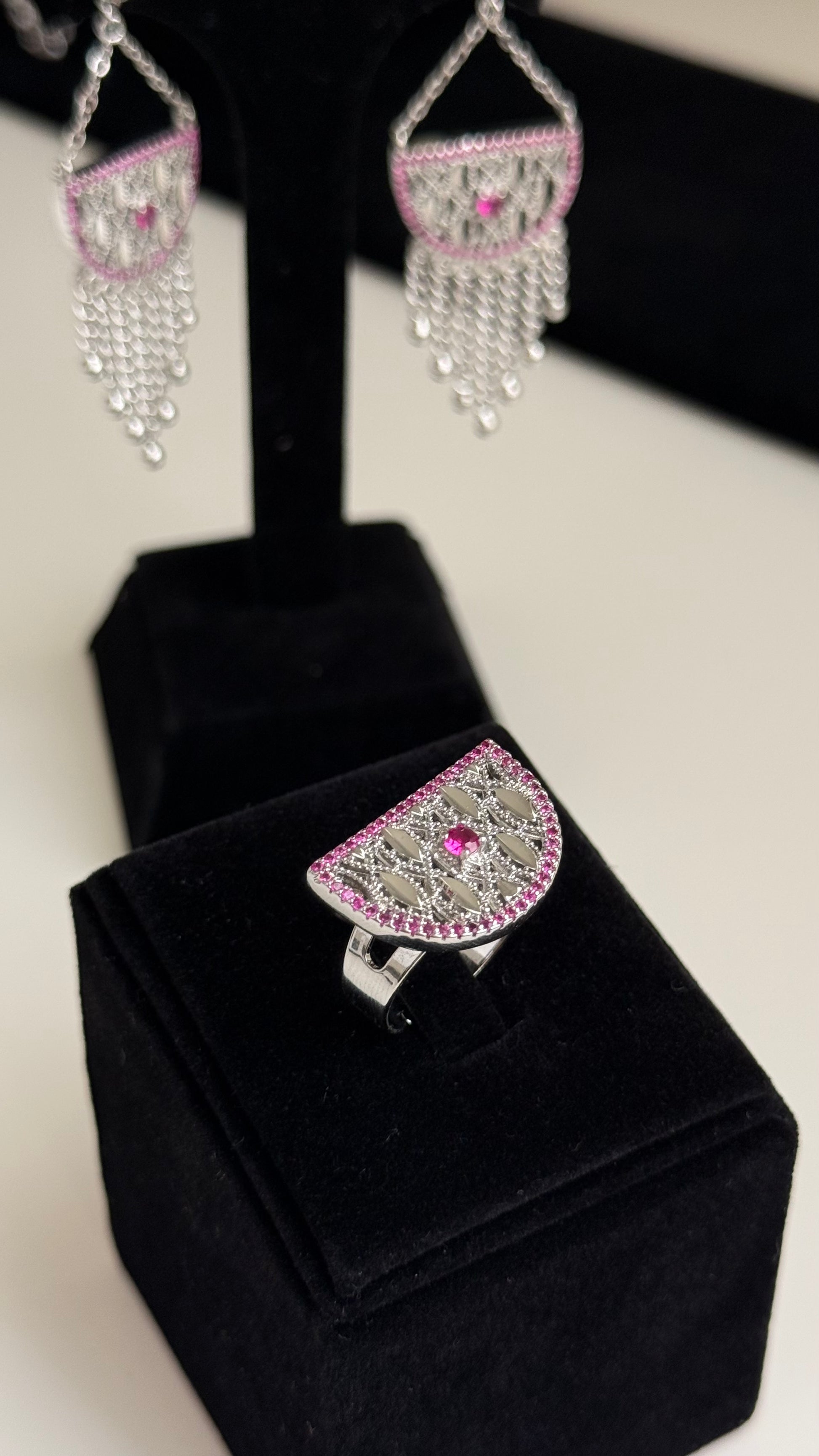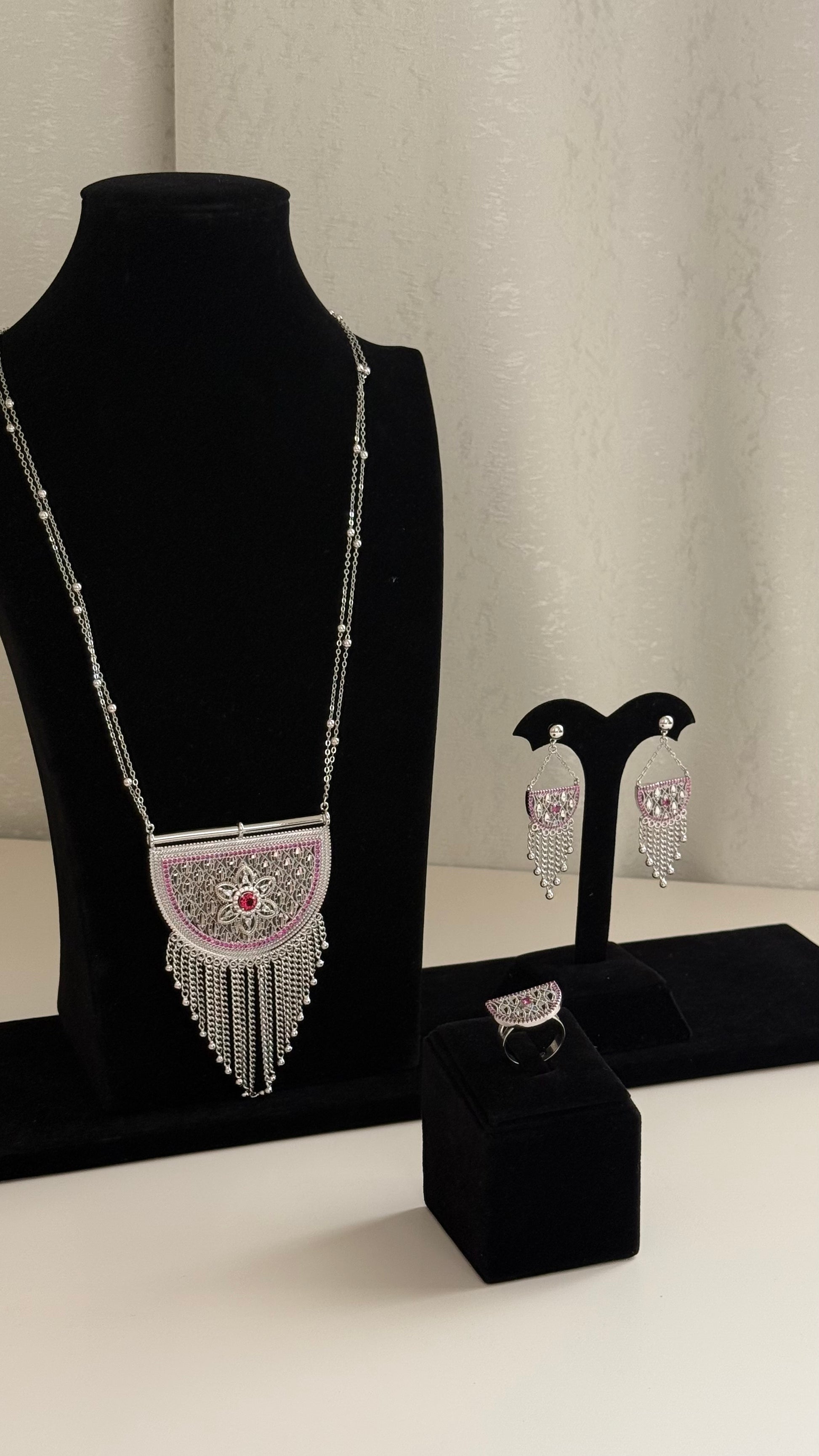 A statement piece of timeless elegance, the Zareen Set blends intricate silver craftsmanship with soft touches of pink to create a truly regal look. This set includes a bold necklace, delicately designed earrings, and a matching ring — perfect for making an impression at traditional events or special occasions.